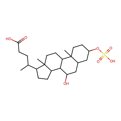 | CCSBASE_9DF38E42CA | Chenodeoxycholic acid 3-sulfate | [M-H]- | 471.24218 | 194.9 | C[C@H](CCC(=O)O)[C@H]1CC[C@@H]2[C@@]1(CC[C@H]3[C@H]2[C@@H](C[C@H]4[C@@]3(CC[C@H](C4)OS(=O)(=O)O)C)O)C | Lipids and lipid-like molecules | -1 | 21 | DT | single field, calibrated | |
