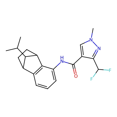 | CCSBASE_F9C7891B09 | Isopyrazam | [M+H]+ | 360.1881987 | 184.74 | CC(C)C1C2CCC1C3=C2C=CC=C3NC(=O)C4=CN(N=C4C(F)F)C | Benzenoids | 1 | 23 | TW | calibrated with small molecules, "System Suitability Test" mix | |