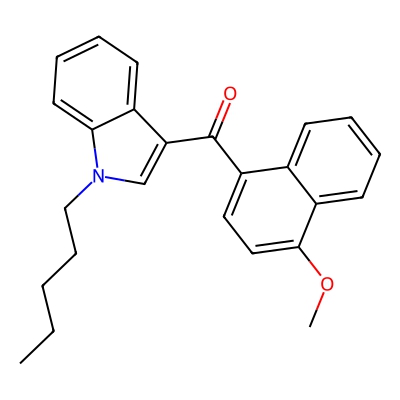 | CCSBASE_5A183BFFBB | JWH-081 | [M+H]+ | 372.195809 | 198.78 | CCCCCN1C=C(C2=CC=CC=C21)C(=O)C3=CC=C(C4=CC=CC=C43)OC | Organoheterocyclic compounds | 1 | 23 | TW | calibrated with small molecules, "System Suitability Test" mix | |