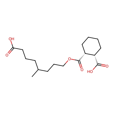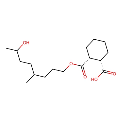 | CCSBASE_876B1AC3C5 | Cyclohexane-1,2-dicarboxylic mono carboxyisooctyl ester | [M-H]- | 327.1813 | 176.73 | CC(CCCC(=O)O)CCCOC(=O)[C@@H]1CCCC[C@@H]1C(=O)O | Organic acids and derivatives | -1 | 24 | DT | single field, calibrated | |
