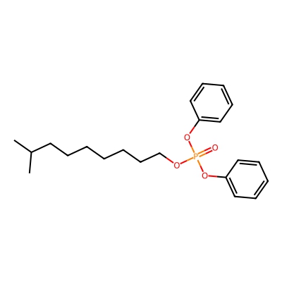 | CCSBASE_1E88670C33 | Isodecyl diphenyl phosphate | [M+H]+ | 391.2033 | 200.2 | CC(C)CCCCCCCOP(=O)(OC1=CC=CC=C1)OC2=CC=CC=C2 | Organic acids and derivatives | 1 | 24 | DT | single field, calibrated | |
