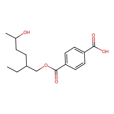 | CCSBASE_F4C260AA79 | Mono(2-ethyl-5-hydroxyhexyl) terephthalate | [M-H]- | 293.1394 | 185.08 | CCC(CCC(C)O)COC(=O)C1=CC=C(C=C1)C(=O)O | Benzenoids | -1 | 24 | DT | single field, calibrated | |