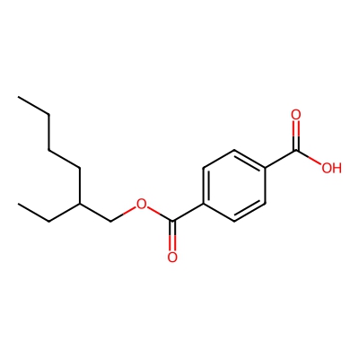 | CCSBASE_84F3D0EB88 | Mono(2-ethylhexyl) terephthalate | [M-H]- | 277.1445 | 183.54 | CCCCC(CC)COC(=O)C1=CC=C(C=C1)C(=O)O | Benzenoids | -1 | 24 | DT | single field, calibrated | |