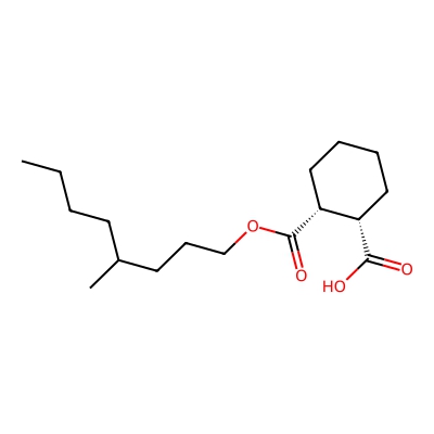 | CCSBASE_22754CF8F8 | Mono-isononyl-cyclohexane-1,2-dicarboxylate | [M-H]- | 297.2071 | 175.48 | CCCCC(C)CCCOC(=O)[C@@H]1CCCC[C@@H]1C(=O)O | Benzenoids | -1 | 24 | DT | single field, calibrated | |