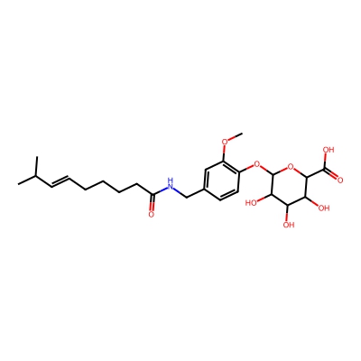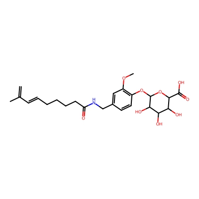 | CCSBASE_361075AF26 | Capsaicin_met017 | [M+H]+ | 482.239 | 215.0 | CC(C)/C=C/CCCCC(=O)NCC1=CC(=C(C=C1)OC2C(C(C(C(O2)C(=O)O)O)O)O)OC | Organic oxygen compounds | 1 | 25 | DT | single field, calibrated |