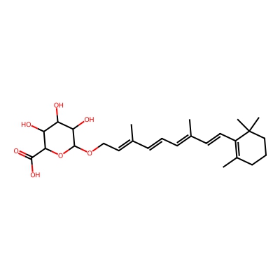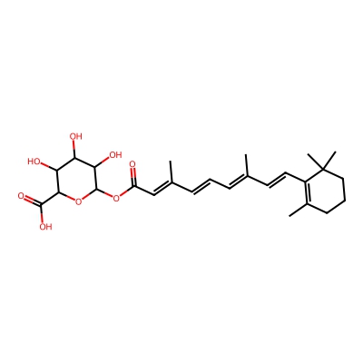 | CCSBASE_16870C9DB6 | Retinol_met010 | [M+H]+ | 477.2488 | 205.6 | CC1=C(C(CCC1)(C)C)/C=C/C(=C/C=C/C(=C/C(=O)OC2C(C(C(C(O2)C(=O)O)O)O)O)/C)/C | Lipids and lipid-like molecules | 1 | 25 | DT | single field, calibrated | |
