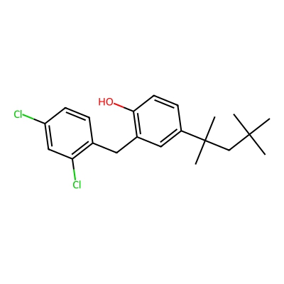 | CCSBASE_B5BB4FB6C9 | Clofoctol | [M+H]+ | 365.1439 | 170.3 | CC(C)(C)CC(C)(C)C1=CC(=C(C=C1)O)CC2=C(C=C(C=C2)Cl)Cl | Benzenoids | 1 | 25 | DT | single field, calibrated | |