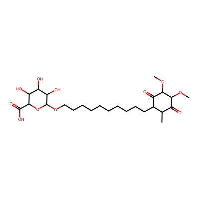 | CCSBASE_E71532354F | Idebenone_met005 | [M+Na]+ | 539.2469 | 214.1 | CC1C(C(=O)C(=C(C1=O)OC)OC)CCCCCCCCCCOC2C(C(C(C(O2)C(=O)O)O)O)O | Lipids and lipid-like molecules | 1 | 25 | DT | single field, calibrated | |