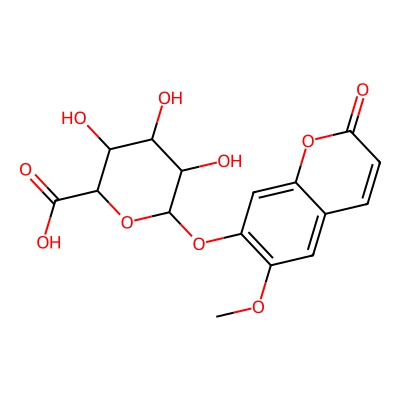 | CCSBASE_005989F13A | Scopoletin_met007 | [M+H]+ | 369.0821 | 179.9 | COC1=C(C=C2C(=C1)C=CC(=O)O2)OC3C(C(C(C(O3)C(=O)O)O)O)O | Phenylpropanoids and polyketides | 1 | 25 | DT | single field, calibrated | |