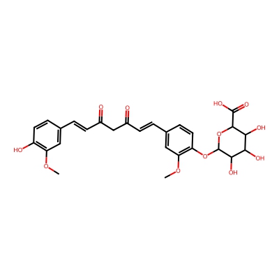 | CCSBASE_73134DC4FA | Curcumin_met019 | [M+H]+ | 545.1659 | 249.0 | COC1=C(C=CC(=C1)/C=C/C(=O)CC(=O)/C=C/C2=CC(=C(C=C2)OC3C(C(C(C(O3)C(=O)O)O)O)O)OC)O | Phenylpropanoids and polyketides | 1 | 25 | DT | single field, calibrated |