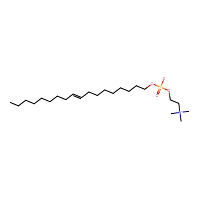 | CCSBASE_47CF2814FA | Elaidylphosphocholine | [M+H-H2O]+ | 416.3293 | 204.4 | CCCCCCCC/C=C/CCCCCCCCOP(=O)([O-])OCC[N+](C)(C)C | Organic nitrogen compounds | 1 | 25 | DT | single field, calibrated | |