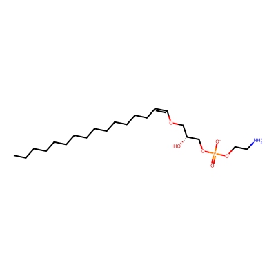 | CCSBASE_728E7B4763 | LPE(p18:0) | [M+H]+ | 466.327 | 222.5 | CCCCCCCCCCCCCCCC/C=C\OC[C@H](COP(=O)([O-])OCC[NH3+])O | Lipids and lipid-like molecules | 1 | 5 | TW | calibrated with phosphatidylcholines (ESI+) and phosphatidylethanolamines (ESI-) | |