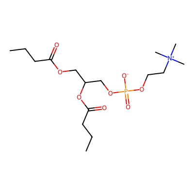 | CCSBASE_943499c54d84eaf37a5aa6931cceb060 | 04:0 PC | [M+H]+ | 398.19382067 | 196.2 | CCCC(=O)OCC(COP(=O)([O-])OCC[N+](C)(C)C)OC(=O)CCC | Lipids and lipid-like molecules | 1 | 27 | TIMS | calibrated with ESI Low Concentration Tuning Mix (Agilent) | |