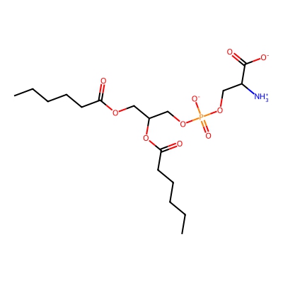 | CCSBASE_04b3ee80c4d1d1a072bcc0f6f307c6f3 | 06:0 PS | [M-H]- | 454.1847474 | 211.1 | CCCCCC(=O)OCC(COP(=O)([O-])OCC([NH3+])C(=O)[O-])OC(=O)CCCCC | None | -1 | 27 | TIMS | calibrated with ESI Low Concentration Tuning Mix (Agilent) | |