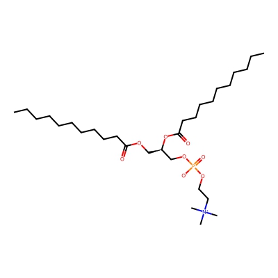 | CCSBASE_e3c68c8aea12aeb3f2255c29ecce81cd | 11:0 PC | [M+Cl]- | 628.3750346 | 258.9 | CCCCCCCCCCC(=O)OC[C@H](COP(=O)([O-])OCC[N+](C)(C)C)OC(=O)CCCCCCCCCC | Lipids and lipid-like molecules | -1 | 27 | TIMS | calibrated with ESI Low Concentration Tuning Mix (Agilent) | |
