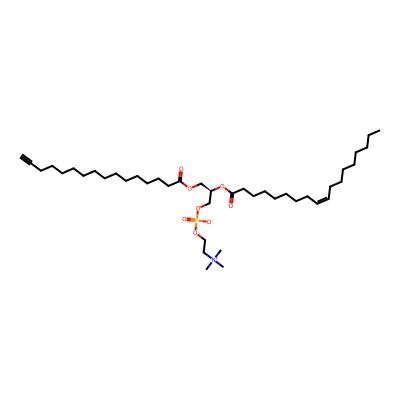 | CCSBASE_967bc1b18478e20c831bebe5336e4d44 | 16:0(alkyne)-18:1 PC | [M+Na]+ | 778.5356962 | 285.033333333 | CCCCCCCC/C=C\CCCCCCCC(=O)O[C@H](COC(=O)CCCCCCCCCCCCCC#C)COP(=O)([O-])OCC[N+](C)(C)C | None | 1 | 27 | TIMS | calibrated with ESI Low Concentration Tuning Mix (Agilent) | |