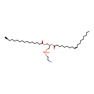 | CCSBASE_2a6bbf23e352b4ae2933eaf8684f12e0 | 16:0(alkyne)-18:1 PE | [M-H]- | 712.4922522 | 267.266666667 | CCCCCCCC/C=C\CCCCCCCC(=O)O[C@H](COC(=O)CCCCCCCCCCCCCC#C)COP(=O)([O-])OCC[NH3+] | None | -1 | 27 | TIMS | calibrated with ESI Low Concentration Tuning Mix (Agilent) |