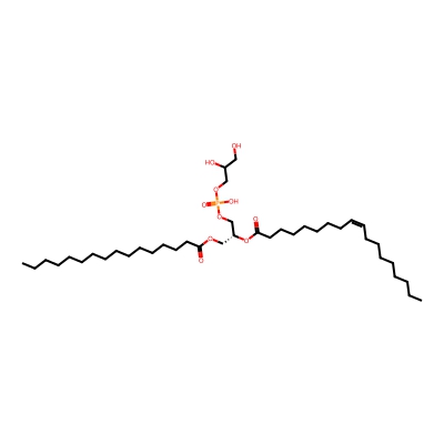 | CCSBASE_22257f5c3325712e8dad2fa74d20d01a | 16:0-18:1 PG | [M-H]- | 747.5181312 | 276.6 | CCCCCCCCCCCCCCCC(=O)OC[C@H](COP(=O)(O)OCC(CO)O)OC(=O)CCCCCCC/C=C\CCCCCCCC | Lipids and lipid-like molecules | -1 | 27 | TIMS | calibrated with ESI Low Concentration Tuning Mix (Agilent) | |