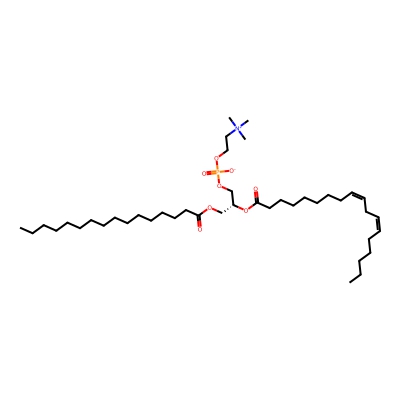 | CCSBASE_c9691d49fdabcaed04f60f6deb85bb64 | 16:0-18:2 PC | [M+Na]+ | 780.5513454 | 288.2 | CCCCCCCCCCCCCCCC(=O)OC[C@H](COP(=O)([O-])OCC[N+](C)(C)C)OC(=O)CCCCCCC/C=C\C/C=C\CCCCC | Lipids and lipid-like molecules | 1 | 27 | TIMS | calibrated with ESI Low Concentration Tuning Mix (Agilent) | |