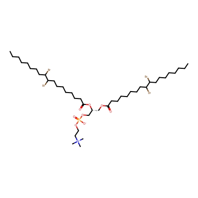 | CCSBASE_ee1e81579d92914d6c3eb85918f759b3 | 18:0 (9,10dibromo) PC | [M+H]+ | 1102.27404387 | 312.333333333 | CCCCCCCCC(C(CCCCCCCC(=O)OC[C@H](COP(=O)([O-])OCC[N+](C)(C)C)OC(=O)CCCCCCCC(C(CCCCCCCC)Br)Br)Br)Br | Lipids and lipid-like molecules | 1 | 27 | TIMS | calibrated with ESI Low Concentration Tuning Mix (Agilent) | |