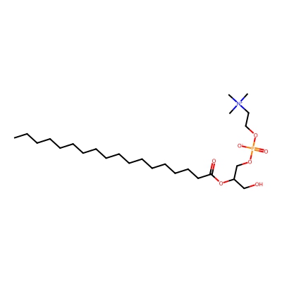 | CCSBASE_0aa0c936908aadab2f12096a325df980 | 2-18:0 Lyso PC | [M+H]+ | 524.37104687 | 239.566666667 | CCCCCCCCCCCCCCCCCC(=O)OC(CO)COP(=O)([O-])OCC[N+](C)(C)C | Lipids and lipid-like molecules | 1 | 27 | TIMS | calibrated with ESI Low Concentration Tuning Mix (Agilent) | |
