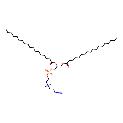 | CCSBASE_e96e8cce4c2d57d80499f4b6707dc9af | 18:0 azidoethyl PC | [M+Na]+ | 867.6309888 | 305.5 | CCCCCCCCCCCCCCCCCC(=O)OC[C@H](COP(=O)([O-])OCC[N+](C)(C)CCN=[N+]=[N-])OC(=O)CCCCCCCCCCCCCCCCC | None | 1 | 27 | TIMS | calibrated with ESI Low Concentration Tuning Mix (Agilent) |