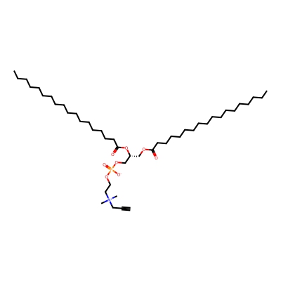 | CCSBASE_4cf0c350bcfe4ce41d0f366732d34287 | 18:0 propargyl PC | [M+Na]+ | 836.6139422 | 304.2 | CCCCCCCCCCCCCCCCCC(=O)OC[C@H](COP(=O)([O-])OCC[N+](C)(C)CC#C)OC(=O)CCCCCCCCCCCCCCCCC | None | 1 | 27 | TIMS | calibrated with ESI Low Concentration Tuning Mix (Agilent) |