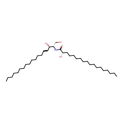 | CCSBASE_fb286d641ba13e142516fba93700fb7e | 18:0(2S-OH) Ceramide | [M-H]- | 580.5310046 | 267.066666667 | CCCCCCCCCCCCCCCC[C@@H](C(=O)N[C@@H](CO)[C@@H](/C=C/CCCCCCCCCCCCC)O)O | Lipids and lipid-like molecules | -1 | 27 | TIMS | calibrated with ESI Low Concentration Tuning Mix (Agilent) | |