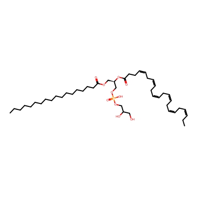 | CCSBASE_aab2102286eca4c9adb0ee80394560e2 | 18:0-22:6 PG | [M+NH4]+ | 840.5748802 | 298.3 | CCCCCCCCCCCCCCCCCC(=O)OC[C@H](COP(=O)(O)OCC(CO)O)OC(=O)CC/C=C\C/C=C\C/C=C\C/C=C\C/C=C\C/C=C\CC | Lipids and lipid-like molecules | 1 | 27 | TIMS | calibrated with ESI Low Concentration Tuning Mix (Agilent) | |