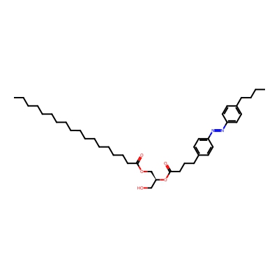 | CCSBASE_012bad0a77eb37ce7cbf2488f7be4140 | 18:0-PhoDAG | [M+Na]+ | 687.4707178 | 269.933333333 | CCCCCCCCCCCCCCCCCC(=O)OC[C@H](CO)OC(=O)CCCC1=CC=C(C=C1)N=NC2=CC=C(C=C2)CCCC | None | 1 | 27 | TIMS | calibrated with ESI Low Concentration Tuning Mix (Agilent) | |