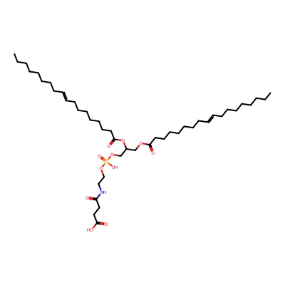 | CCSBASE_41939c32616348a5ae6552c35023bc54 | 18:1 Succinyl PE | [M-H]- | 842.5552432 | 296.366666667 | CCCCCCCCC=CCCCCCCCC(=O)OCC(COP(=O)(O)OCCNC(=O)CCC(=O)O)OC(=O)CCCCCCCC=CCCCCCCCC | None | -1 | 27 | TIMS | calibrated with ESI Low Concentration Tuning Mix (Agilent) | |