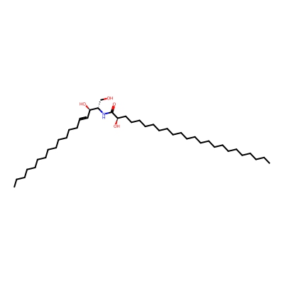| CCSBASE_7dd8ec04242d1433cd5c227a66c0fca0 | 24:0(2R-OH) Ceramide | [M-H]- | 664.6248998 | 285.433333333 | CCCCCCCCCCCCCCCCCCCCCC[C@H](C(=O)N[C@@H](CO)[C@@H](/C=C/CCCCCCCCCCCCC)O)O | Organic oxygen compounds | -1 | 27 | TIMS | calibrated with ESI Low Concentration Tuning Mix (Agilent) |