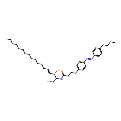 | CCSBASE_667313ed621d0f0ce4a6308896ea729f | ACe-1 | [M+Na]+ | 628.4448388 | 263.0 | CCCCCCCCCCCCC/C=C/[C@H]([C@H](CO)NC(=O)CCCC1=CC=C(C=C1)N=NC2=CC=C(C=C2)CCCC)O | None | 1 | 27 | TIMS | calibrated with ESI Low Concentration Tuning Mix (Agilent) | |