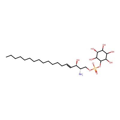| CCSBASE_e7d24f3fa7d7d6148253741915eeec5a | Sphingosyl PI (d18:1) | [M+H]+ | 542.30884427 | 232.166666667 | CCCCCCCCCCCCC/C=C/[C@H]([C@H](COP(=O)([O-])OC1C([C@H](C(C(C1O)O)O)O)O)[NH3+])O | Lipids and lipid-like molecules | 1 | 27 | TIMS | calibrated with ESI Low Concentration Tuning Mix (Agilent) | |