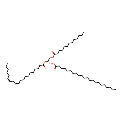 | CCSBASE_6EA95EC2DC | TG(55:2) | [M+NH4]+ | 918.849 | 329.2 | CCCCCCCCCCCCCCCCCCCCCC(=O)OC[C@@H](COC(=O)CCCCCCCCCCCC)OC(=O)CCCCCCCCC/C=C\C/C=C\CCCCC | Lipids and lipid-like molecules | 1 | 9 | DT | single field, calibrated with Agilent tune mix (Agilent) | |