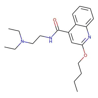 | CCSBASE_0CBE1E4603 | Dibucaine | [M+H]+ | 344.2338 | 194.1 | CCCCOC1=NC2=CC=CC=C2C(=C1)C(=O)NCCN(CC)CC | small molecule | 1 | 26 | DT | single field, calibrated | |
