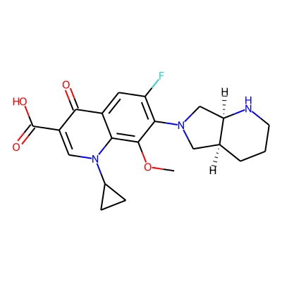 | CCSBASE_CE3E85D491 | Moxifloxacin | [M+H-H2O]+ | 384.1723 | 187.1 | COC1=C2C(=CC(=C1N3C[C@@H]4CCCN[C@@H]4C3)F)C(=O)C(=CN2C5CC5)C(=O)O | small molecule | 1 | 26 | DT | single field, calibrated | |