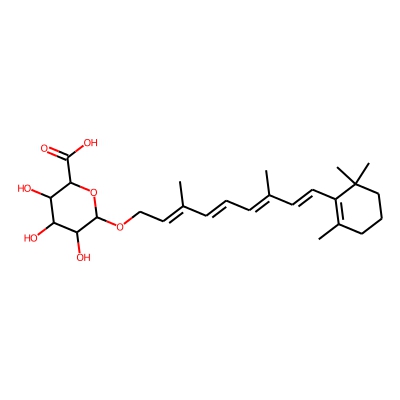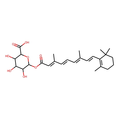 | CCSBASE_16870C9DB6 | Retinol_met010 | [M+H]+ | 477.2488 | 205.6 | CC1=C(/C=C/C(C)=C/C=C/C(C)=C/C(=O)OC2OC(C(=O)O)C(O)C(O)C2O)C(C)(C)CCC1 | small molecule | 1 | 26 | DT | single field, calibrated | |
