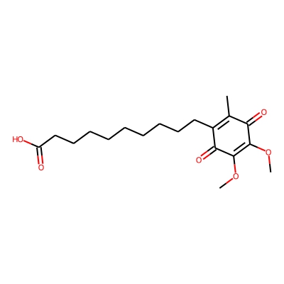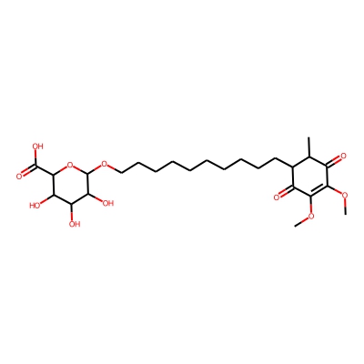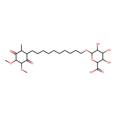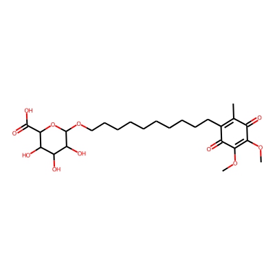 | CCSBASE_E71532354F | Idebenone_met005 | [M+Na]+ | 539.2469 | 214.1 | COC1=C(OC)C(=O)C(CCCCCCCCCCOC2OC(C(=O)O)C(O)C(O)C2O)C(C)C1=O | small molecule | 1 | 26 | DT | single field, calibrated | |
