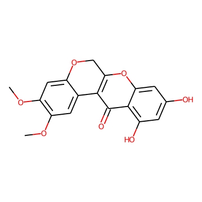 | CCSBASE_33D59BF50E | Apotoxicarol | [M+H]+ | 343.0818 | 173.2 | COC1=C(C=C2C(=C1)C3=C(CO2)OC4=CC(=CC(=C4C3=O)O)O)OC | small molecule | 1 | 26 | DT | single field, calibrated | |