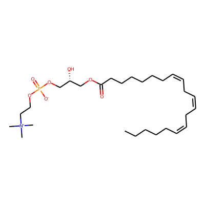 | CCSBASE_FE011A058B | LPC(20:3) | [M+H]+ | 546.356 | 239.0 | [C@](COP(=O)([O-])OCC[N+](C)(C)C)([H])(O)COC(CCCCCC/C=C\C/C=C\C/C=C\CCCCC)=O | lipid | 1 | 5 | TW | calibrated with phosphatidylcholines (ESI+) and phosphatidylethanolamines (ESI-) | |