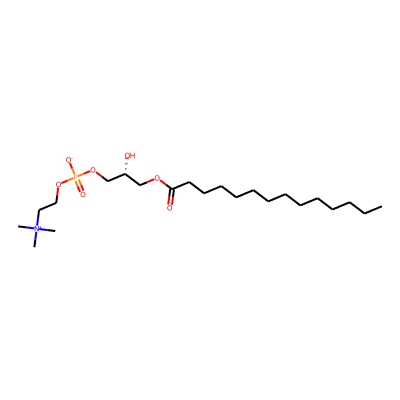 | CCSBASE_F16300D442 | LPC(14:0) | [M+H]+ | 468.309 | 220.8 | [C@](COP(=O)([O-])OCC[N+](C)(C)C)([H])(O)COC(CCCCCCCCCCCCC)=O | lipid | 1 | 5 | TW | calibrated with phosphatidylcholines (ESI+) and phosphatidylethanolamines (ESI-) | |