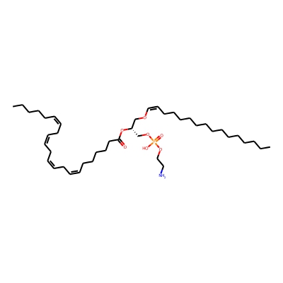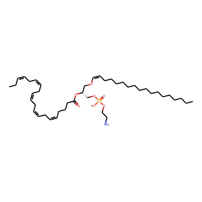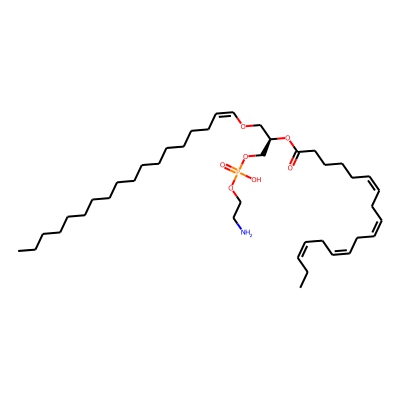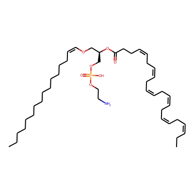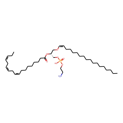 | CCSBASE_3E1EC67F6E | PE(p38:4) | [M-H]- | 750.543 | 270.3 | [C@](COP(=O)(O)OCCN)([H])(OC(CCCCC/C=C\C/C=C\C/C=C\C/C=C\CCCCC)=O)CO/C=C\CCCCCCCCCCCCCC | lipid | 1 | 5 | TW | calibrated with phosphatidylcholines (ESI+) and phosphatidylethanolamines (ESI-) |