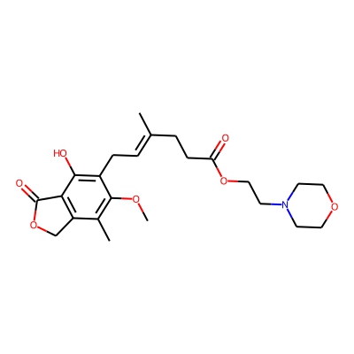| CCSBASE_34F17EF400 | MYCOPHENOLATE MOFETIL | [M+H]+ | 434.2174 | 197.3 | CC1=C(C(=C(C2=C1COC2=O)O)C/C=C(\C)/CCC(=O)OCCN3CCOCC3)OC | small molecule | 1 | 7 | TW | calibrated with polyalanine and drug standards | |