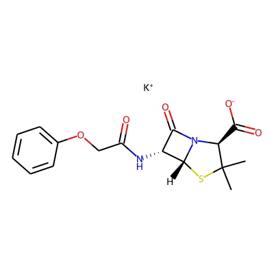 | CCSBASE_E9F538241F | PENICILLIN V POTASSIUM | [M+H]+ | 351.1009 | 182.7 | CC1([C@@H](N2[C@H](S1)[C@@H](C2=O)NC(=O)COC3=CC=CC=C3)C(=O)[O-])C.[K+] | small molecule | 1 | 7 | TW | calibrated with polyalanine and drug standards | |