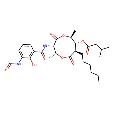 | CCSBASE_DA7733883B | ANTIMYCIN A | [M+H]+ | 535.265 | 239.1 | CCCCCC[C@@H]1[C@H]([C@@H](OC(=O)[C@H]([C@H](OC1=O)C)NC(=O)C2=C(C(=CC=C2)NC=O)O)C)OC(=O)CC(C)C | small molecule | 1 | 7 | TW | calibrated with polyalanine and drug standards | |