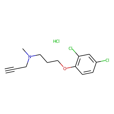| CCSBASE_684B982EAC | CLORGILINE HYDROCHLORIDE | [M+H]+ | 272.0604 | 157.0 | CN(CCCOC1=C(C=C(C=C1)Cl)Cl)CC#C.Cl | small molecule | 1 | 7 | TW | calibrated with polyalanine and drug standards | |