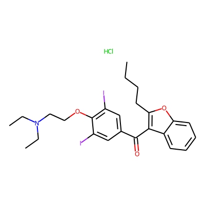 | CCSBASE_5FFAD0C1BA | AMIODARONE HYDROCHLORIDE | [M+H]+ | 646.031 | 226.3 | CCCCC1=C(C2=CC=CC=C2O1)C(=O)C3=CC(=C(C(=C3)I)OCCN(CC)CC)I.Cl | small molecule | 1 | 7 | TW | calibrated with polyalanine and drug standards | |