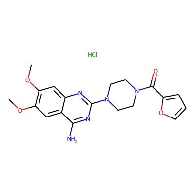 | CCSBASE_E3F920ED19 | PRAZOSIN HYDROCHLORIDE | [M+H]+ | 384.1667 | 193.4 | COC1=C(C=C2C(=C1)C(=NC(=N2)N3CCN(CC3)C(=O)C4=CC=CO4)N)OC.Cl | small molecule | 1 | 7 | TW | calibrated with polyalanine and drug standards | |
