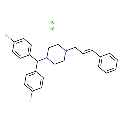 | CCSBASE_456C32AD96 | FLUNARIZINE HYDROCHLORIDE | [M+H]+ | 405.2137 | 210.3 | C1CN(CCN1C/C=C/C2=CC=CC=C2)C(C3=CC=C(C=C3)F)C4=CC=C(C=C4)F.Cl.Cl | small molecule | 1 | 7 | TW | calibrated with polyalanine and drug standards | |